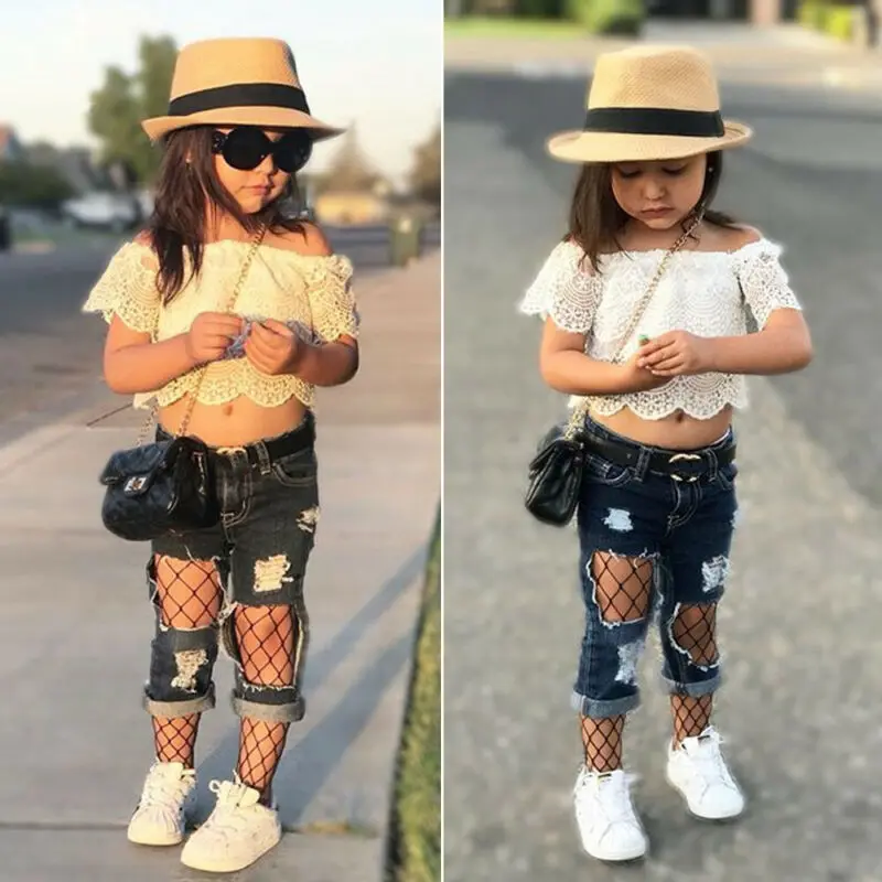 Limited Price for Toddler Kids Baby Girl Clothes Baby Summer Clothing Off Shoulder Lace Tops Ripped Fishnet Patchwork